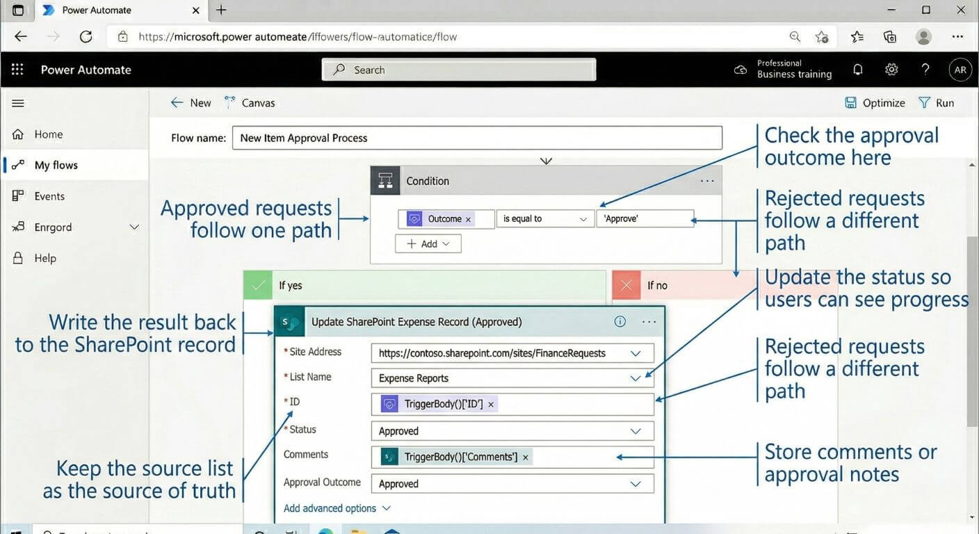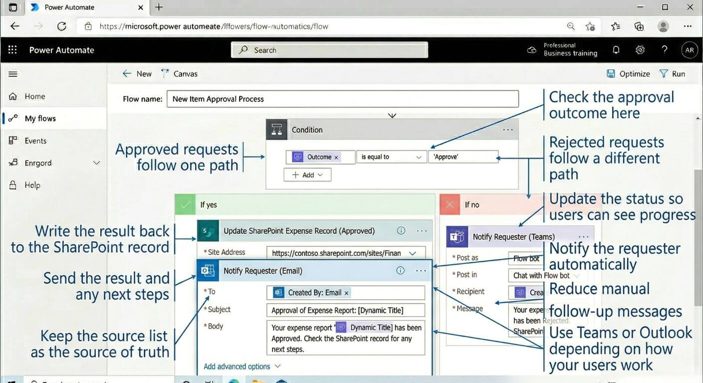 For many Microsoft 365 teams, the easiest pattern is simple: store requests in SharePoint, trigger the flow in Power Automate, send the approval, then write the decision back to the record and notify the right people. Once that works well, more advanced automation becomes much easier to justify and design.