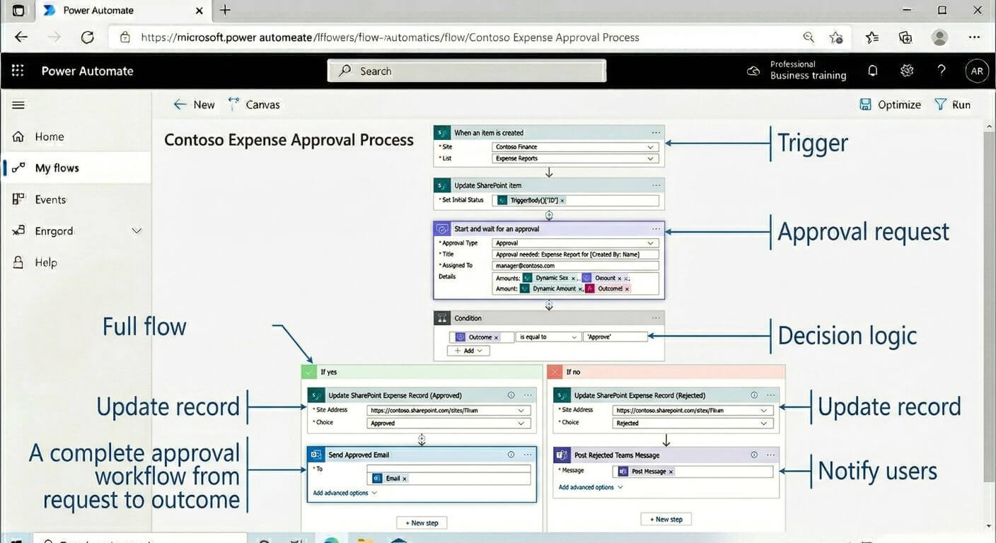 You can automate an approval workflow in Power Automate by triggering a flow from a SharePoint list, Form, or manual request, then using the Approvals action to send the request, capture responses, update status, and notify the right people automatically. In practice, that means fewer follow-up emails, faster decisions, and a clearer audit trail for requests such as leave, purchases, content sign-off, or document review.