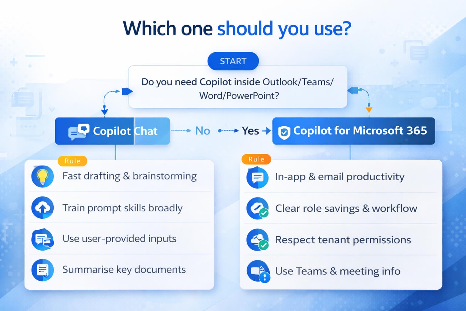 4) Upgrade when context matters: if the use case depends on internal emails, meetings, chats and files, Copilot Chat alone will feel limited.